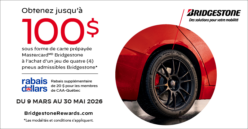 Remise postale jusqu'à 100 $ à l'achat de 4 pneus Bridgestone sélectionnés